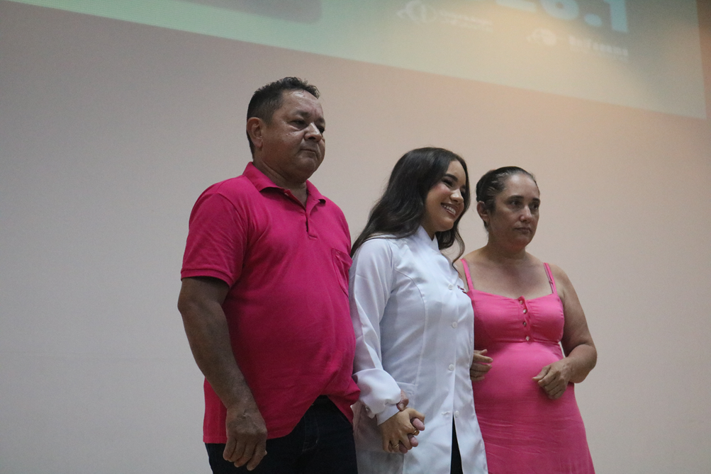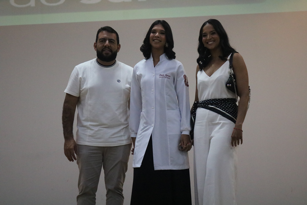 A professora homenageada, Prof.ª. MSc. Meiryellen Castelo Branco Rodrigues da Silva, também enfatizou a importância do momento na construção da identidade profissional dos acadêmicos. Em sua fala, evidenciou que o jaleco carrega valores que vão além da prática técnica. Ela destacou que vestir o jaleco é assumir uma postura ética e humanizada diante dos desafios da área da saúde.