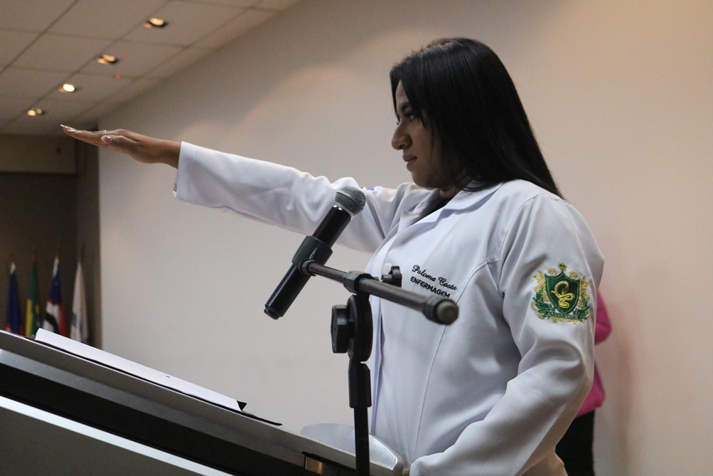 Representando os estudantes, a acadêmica Paloma Thais Costa e Silva conduziu o juramento do curso de Bacharelado em Enfermagem, reafirmando o compromisso dos futuros profissionais com a dignidade humana, o sigilo profissional, a ética e o respeito à vida em todas as suas fases.