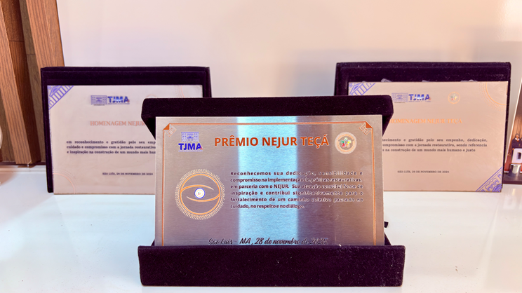 Durante a solenidade de encerramento, o UniFacema e a coordenação do NPJ receberam o Prêmio “NEJUR Teçá”, concedido a pessoas e instituições que se destacaram, ao longo de 2025, na implementação, fortalecimento e difusão da Justiça Restaurativa no Maranhão. O reconhecimento é resultado direto do trabalho desenvolvido pelo coordenador do NPJ como facilitador restaurativo, aliado ao engajamento institucional do UniFacema na promoção de práticas que priorizam o diálogo, a corresponsabilidade e a resolução pacífica de conflitos.